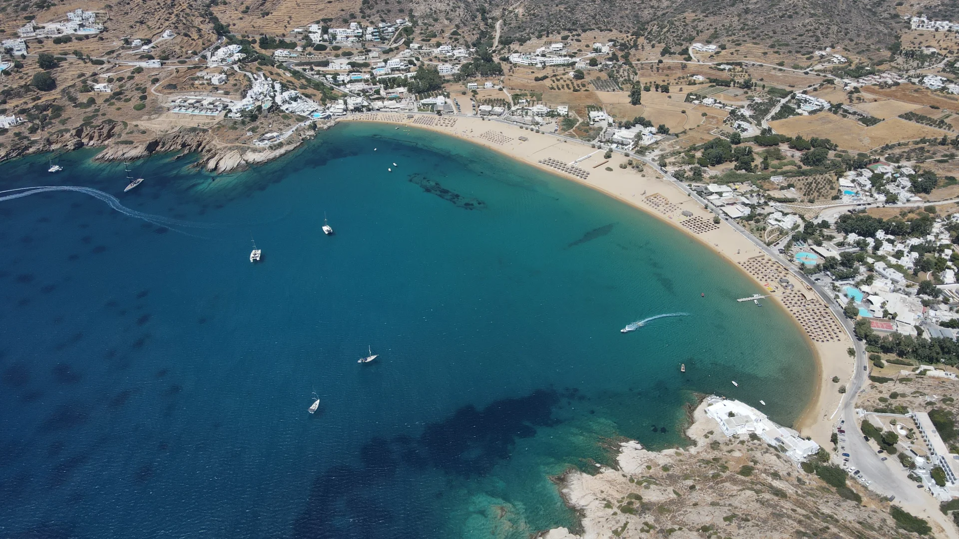 It is an extensive beach with golden sand and crystal-clear, azure waters. From above, the beach resembles a petal, stretching 1 kilometer in length and reaching a width of 70 meters at certain points, while rocks at both ends form its natural boundaries. It is considered one of the most beautiful beaches in the Cyclades, and together with Manganari, they are the most impressive beaches of Ios.